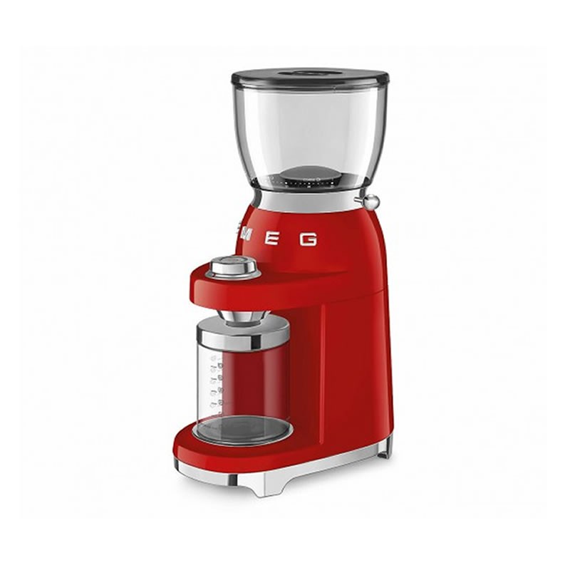 SMEG CGF03RDEU este o râșniță electrică de cafea cu design retro 50’s și finisaj roșu lucios. Are râșniță conică din oțel inoxidabil, recipient pentru boabe de 240 g, 15 niveluri macro de măcinare, 8 funcții presetate, funcții pentru espresso simplu și dublu, cantitate reglabilă de cafea, sistem antistatic, recipient cu sistem Twist & Lock și putere de 150 W.